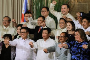 President Rodrigo Duterte and his appointees do the fist gesture after the oath-taking ceremony at the Rizal Hall in Malacañan Palace on August 15. (MNS photo)