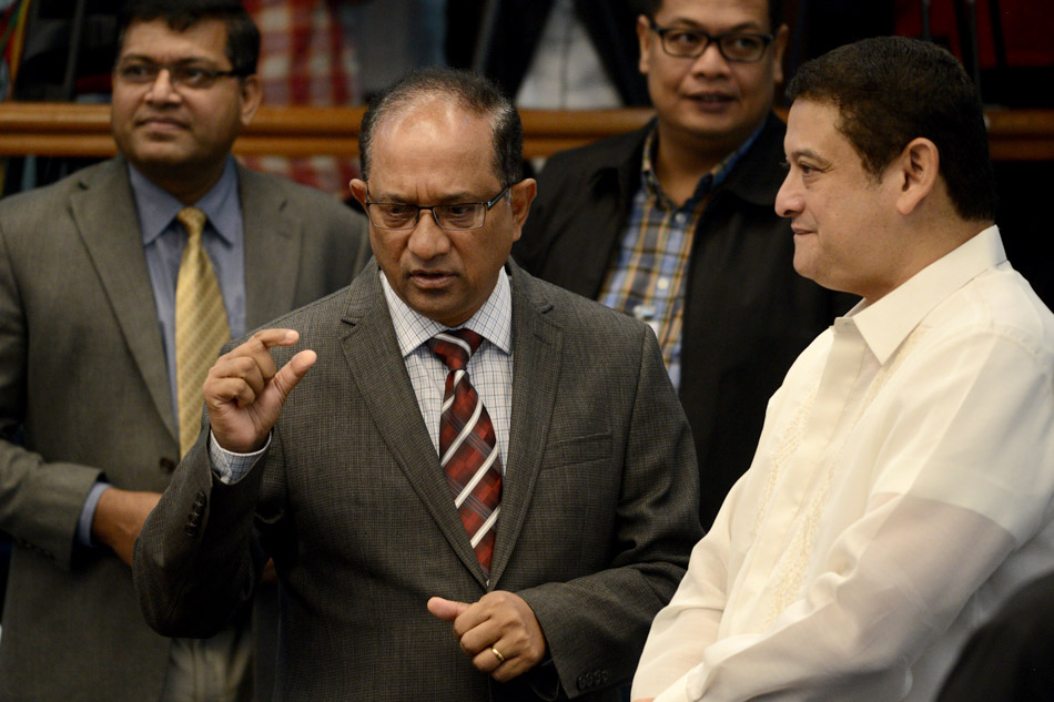 Bangladesh Ambassador to the Philippines John Gomes (2nd left) talks to Senator Teofisto Guingona III on Tuesday during the Senate hearing on the $81-million money laundering heist. Hackers transferred the amount last February from the Bangladesh central bank to the RCBC Jupiter branch in Makati, after which it was laundered in casinos.(MNS photo)
