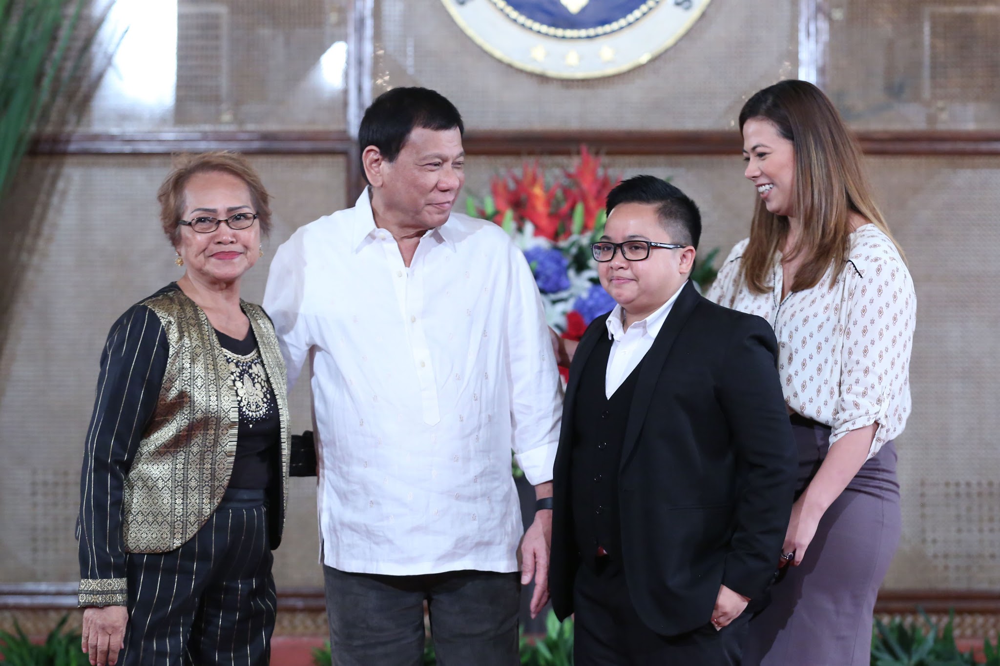 President Rodrigo Duterte poses for a photo with National Youth Commission Chairperson Cariza Yamson Seguera and Film Development Council Chairperson Mary Liza Diño after the oath-taking ceremony at the Rizal Hall in Malacañan Palace on August 15.(MNS photo)